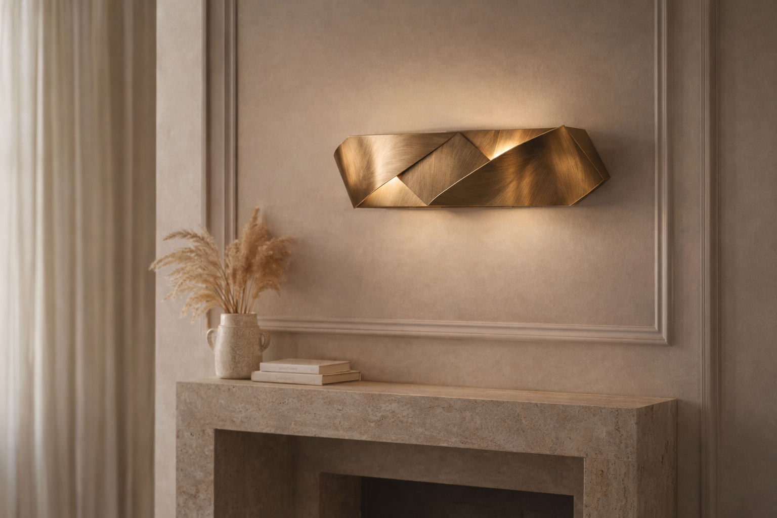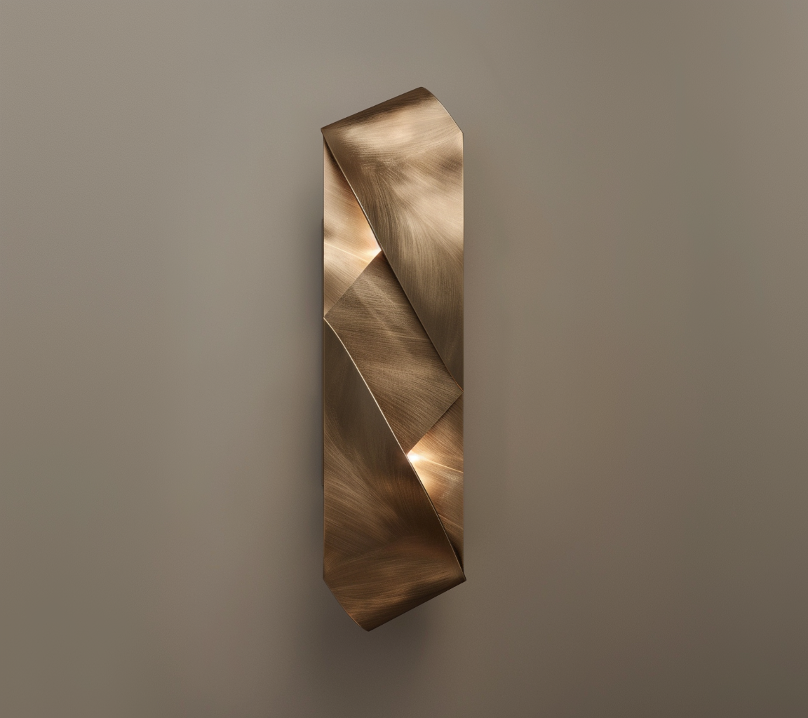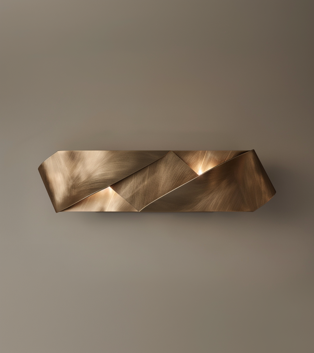 Une ligne continue en laiton brossé capte la lumière et la diffuse par réflexion, créant un jeu subtil d’ombres et de reflets.