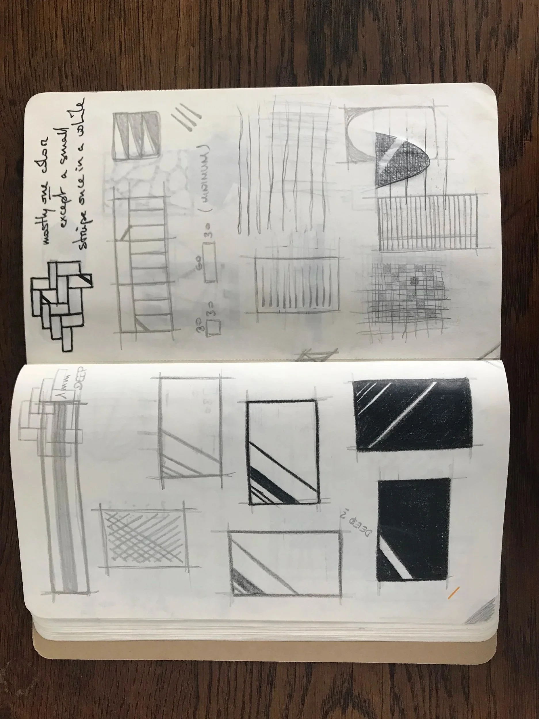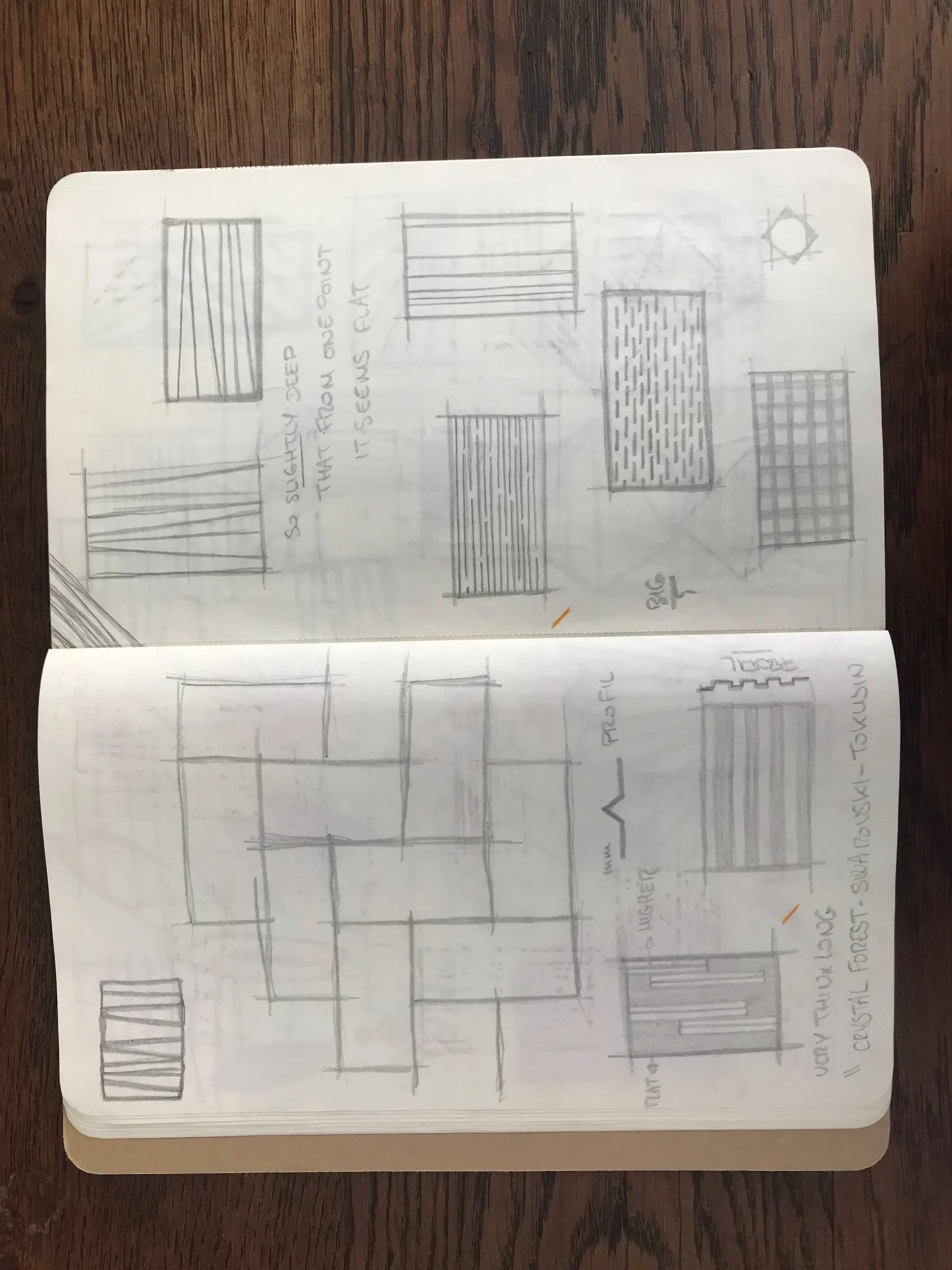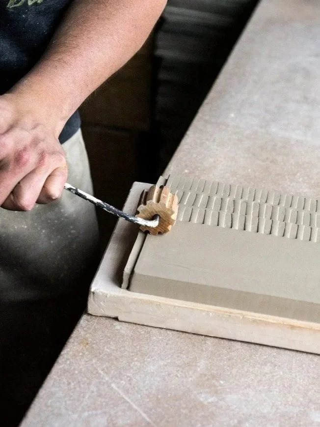 Une phase d’exploration est menée à travers de nombreux croquis et expérimentations matière, notamment par la réalisation de carreaux tests à partir de moules et d’empreintes variées afin d’observer les effets de texture et de lumière.